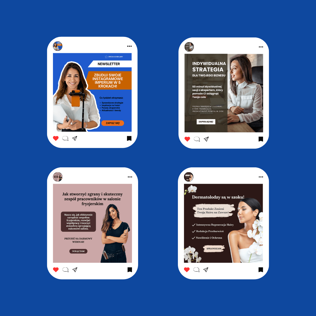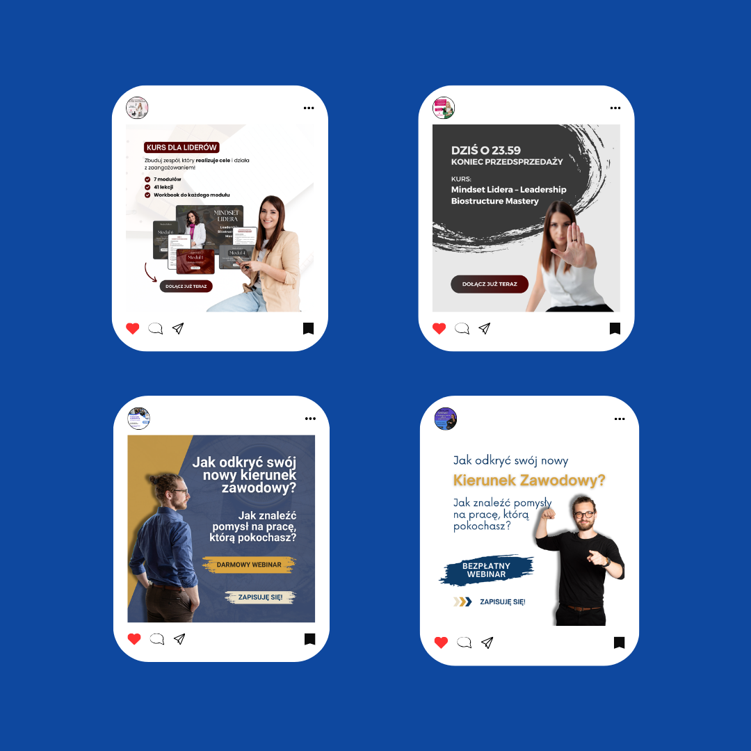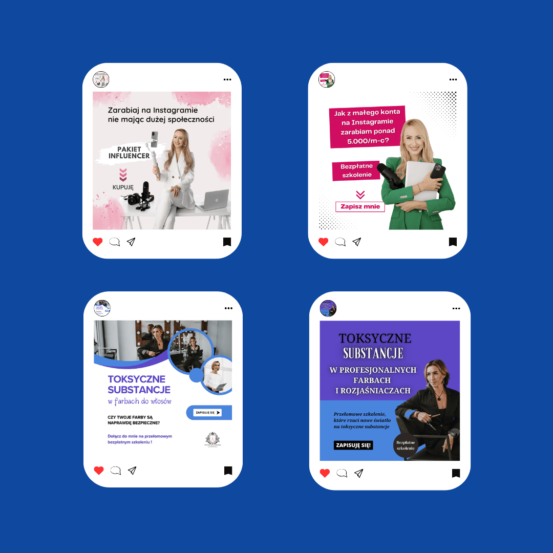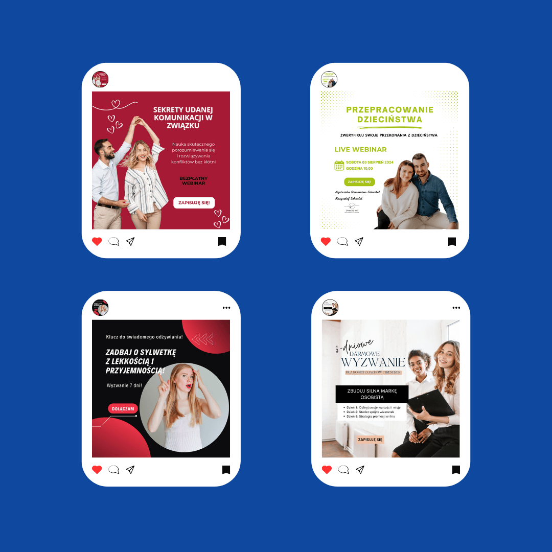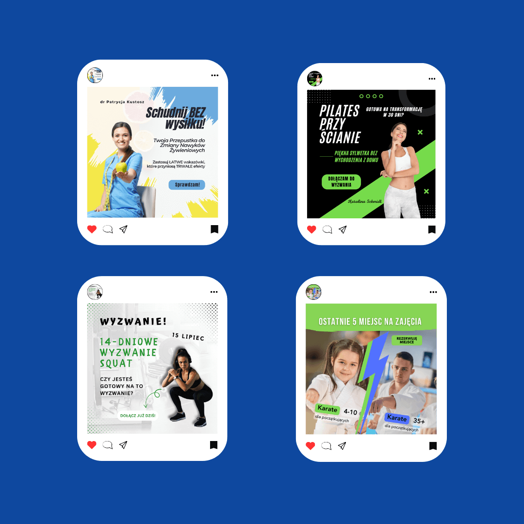 Tworzę spójne i przyciągające wzrok grafiki na social media, które odzwierciedlają charakter Twojej marki. Dbam o dopasowanie kolorów, typografii i stylu, aby każda publikacja budowała rozpoznawalność i zaangażowanie Twoich odbiorców.