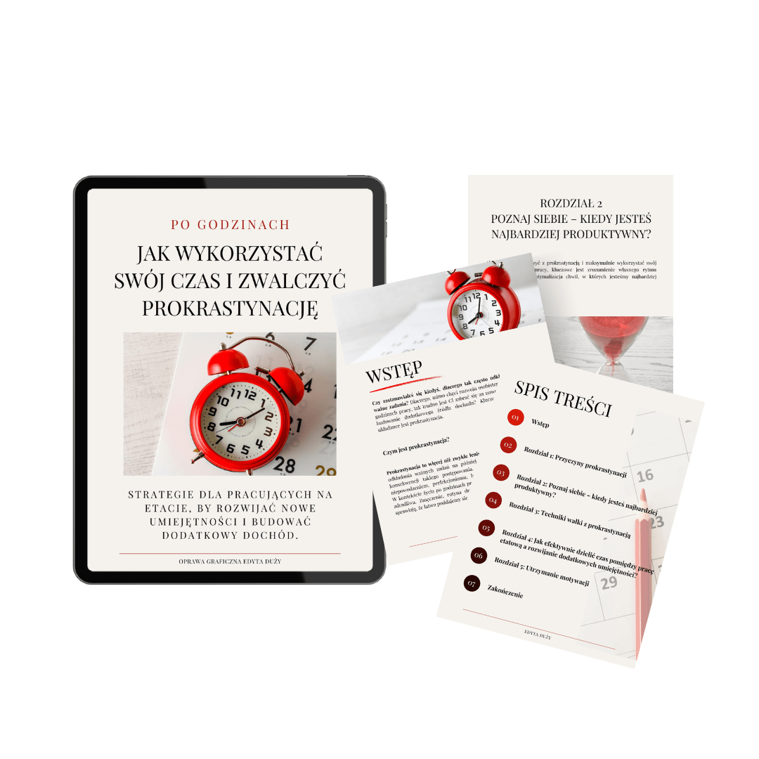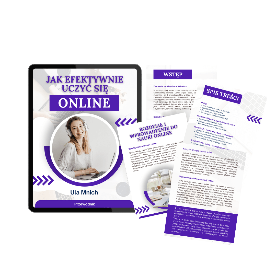 Tworzę mocupy kursów i e-booków, prezentując je w realistyczny sposób na urządzeniach, w formie książki, notatnika czy pudełka. Takie projekty pomagają w pełni zobrazować finalny produkt, przyciągając uwagę potencjalnych klientów.